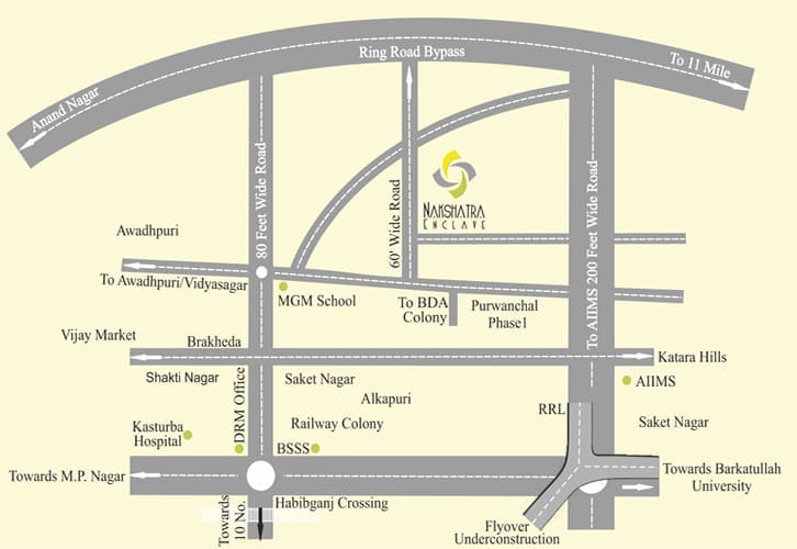 Nakshatra Enclave offers luxurious 3 BHK apartments with exclusive features and modern amenities. The apartments located at 80' DRM Road, Purvanchal, Opp. BDA Road, Awadhpuri, Bhopal are available in 1100 Sqft. Super built-up area. The project also offers a secure and convenient lifestyle to its residents with power backup service among other facilities.